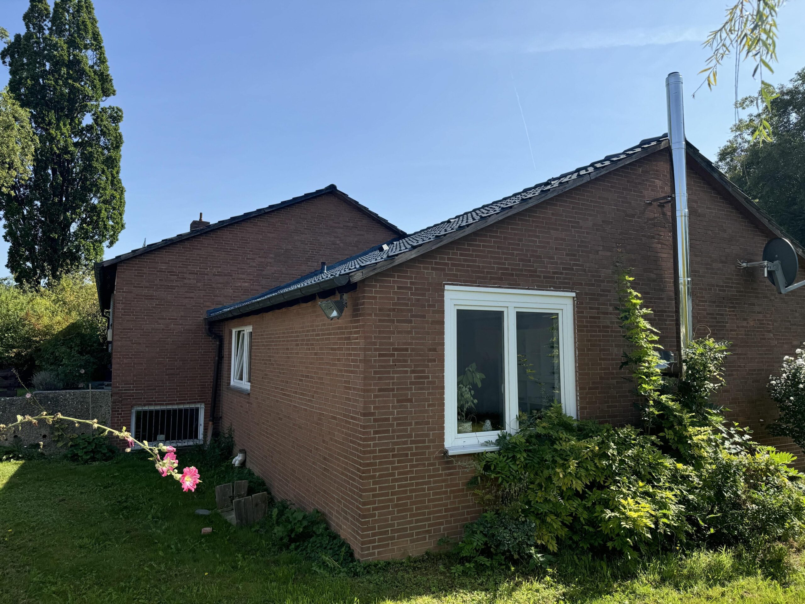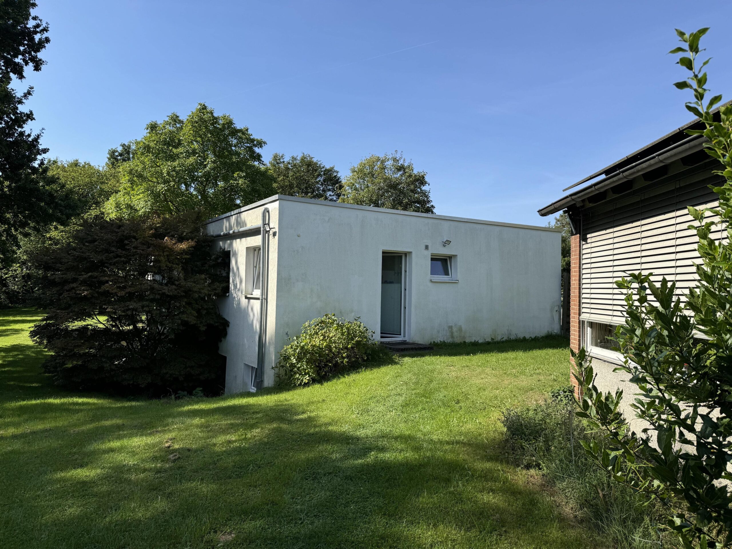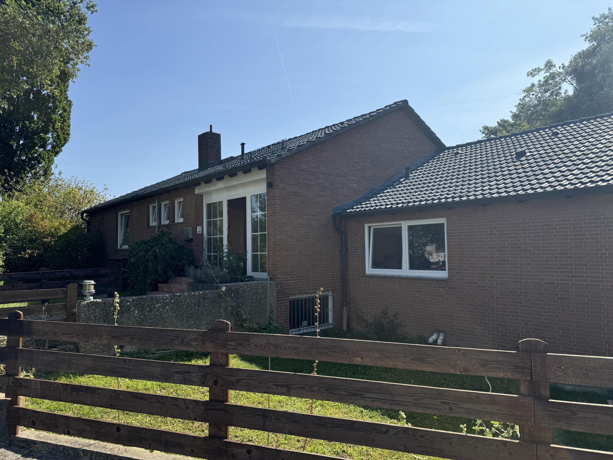 (Objekt 116) Das 1963 erbaute – und mit 183m² Wohnfläche in großzügige – Einfamilienhaus hat Einiges zu bieten: der Eingangsbereich mit Kamin-Sitzecke, fünf Zimmer, eine offene Küche mit Terracottafliesen, Einbauküche und Essbereich sowie das angrenzende Wohn-/Esszimmer mit Kamin bieten viel Platz zum Ausbreiten und Wohlfühlen. Das Badezimmer verfügt sowohl über eine Dusche als auch über eine Whirlwanne. Des Weiteren gibt es ein Gäste-WC im Eingangsbereich. Der Keller hat einen separaten Eingang zu einem ausgebauten Souterrain. Dieses bietet nicht nur mehr Platz (ca. 64 m² Wohnfläche), sondern auch eine gute Gelegenheit eine Einliegerwohnung – egal ob zu privaten oder gewerblichen Zwecken – zu schaffen. Denn hier stehen ein Wohn- und ein Schlafzimmer, ein Badezimmer mit Dusche und ein Abstellraum zur Verfügung. Ein direkter Gartenzugang ist ebenfalls vorhanden. Beheizt wird das Haus über eine Gas-Zentralheizung aus dem Bj. 2024. Die jetzige Ergotherapiepraxis steht zu gewerblicher oder private Nutzung bereit, ist 2007 als Passivhaus erbaut worden. Auf rund 230 m²Nutzfläche verteilen sich der Wartebereich, 4 Therapieräume, ein Abstellraum, ein Personalraum, ein Bad, zwei separate WC´s, ein Lager- sowie ein Technikraum. Der Therapieraum 3 ist ein große Halle mit ca. 6 Metern Deckenhöhe und separaten . Eine im Jahr 2020 installierte Photovoltaikanlage generiert eigenen Strom, die jährlich ca. 20.000 KW erwirtschaftet. Auf dem 5.307 m² großen Grundstück finden eine Gartenterrasse, ein hübsch angelegter Gartenteich mit kleiner Brücke, eine Sauna, ein ca. 1000 m² Pferde-Paddock (komplett umzäunt und mit Strom gesichert), ein größeres Gewächs- sowie ein Gerätehaus ihre Plätze. Überzeugen Sie sich bei einer Besichtigung von den Vorzügen dieser Immobilie und vereinbaren Sie einen Termin. Sollten Ihnen die Räumlichkeiten der Gewerbeeinheit nicht ausreichen, besteht die Möglichkeit einer Aufstockung von bis zu 2 weiteren Etagen oder ein weiterer Bau auf dem Grundstück.